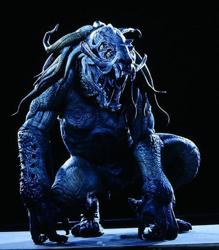 APPEARANCE: Charcoal grey fur with a flowing mane and bushy tail. Each hand has 4 sharp claws, one serving as the thumb and the other as fingers. Each elbow and shoulder are spiked. Eyes are solid red with no pupil or sclera. The jaw has four hinges and can open outward. Has long, sharp fangs and teeth. The inside of the mouth is also red. Image of a typical Loboan